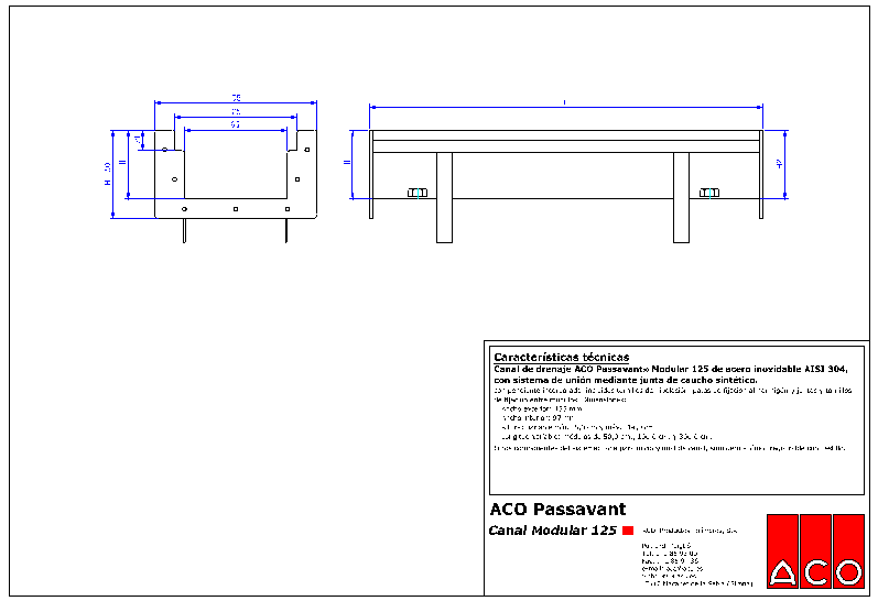 ML.- Canal de drenaje CM90 ACO Passavant , en acero inoxidable AISI 304, de 120mm de ancho exterior, con sistema de unión mediante junta de caucho sintético. Incluidas juntas de estanqueidad entre módulos y tornillería adicional para la instalación. Con tornillos de nivelación y patas de anclaje al hormigón. Altura variable entre 55 y 120mm. con tapa ciega para canal CM125 ACO Passavant , de acero inoxidable AISI 304 y longitud variable. Apta para soportar tráfico ligero. |